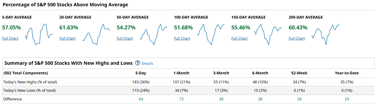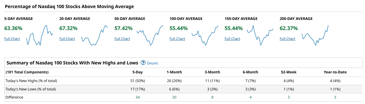 The Nasdaq 100 continues to lead participation, especially at the front of the curve. 63.36 percent of components are above the 5-day average and 67.32 percent above the 20-day, the strongest short-term readings across the four groups. The 50-day measure is 57.42 percent, while both the 100-day and 150-day rest at 55.44 percent. The long-term trend remains notably firm, with 62.37 percent above the 200-day. New highs versus new lows echo this leadership profile. Over 5 days, the spread is a robust +34, with +20 at 1 month, +8 at 3 months, and still positive at +4 at 6 months. The 52-week and year-to-date spreads both hold at +3. This is not a runaway advance, but it is persistent leadership with steady follow-through across multiple lookbacks.