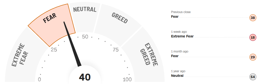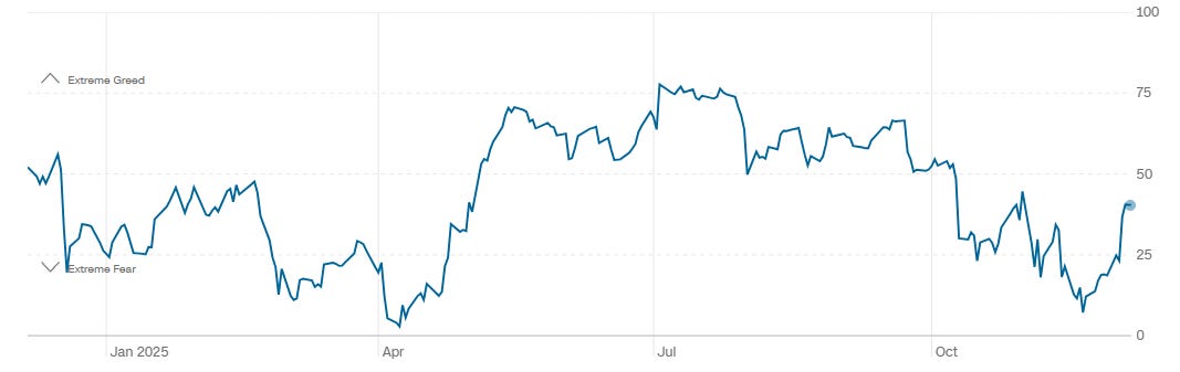 The CNN Fear and Greed composite currently registers 40, firmly in the Fear zone but well above the extreme fear lows recorded just one week ago at 18. One month ago the reading stood at 29, also Fear, while one year ago it was 54, or Neutral. The one-year trend shows sentiment cycling from fear through mid-year optimism and back into fear again in early autumn, with the latest rebound still modest in scope. This is not a market gripped by euphoria. Instead, it reflects a cautious recovery in confidence after a sharp psychological drawdown. From a tactical perspective, readings in the 30 to 45 range often correspond to constructive entry zones rather than exhaustion points. A push back toward 60 would suggest that the wall of worry has been largely climbed and that upside may become more incremental. A relapse toward 20 or below would signal renewed stress and likely coincide with another opportunity created by forced selling rather than organic distribution.