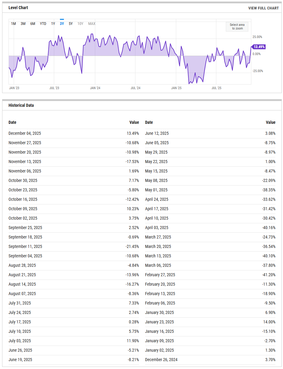 The NAAIM Exposure Index confirms that active managers have responded to the improvement in tone by reloading risk. The latest reading on December 3 is 98.57, a sharp step up from the mid-to-high 80s of recent weeks and effectively a return to near full investment. Several October and November readings already printed near or above 100, so this is clearly not a tentative reentry of exposure but an aggressive recommitment. This posture implies that a large portion of available dry powder has already been deployed, leaving the market more sensitive to any adverse price movement. Elevated exposure does not cap upside on its own, but it does increase the risk that any downside impulse could be amplified by forced de-risking. A pullback in NAAIM toward the 50s without material index damage would be constructive and reset optionality. A sustained run above 90 to 100, however, increases the market’s dependence on continued upside momentum to avoid positioning stress.