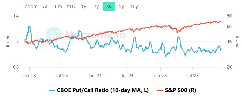 The 10-day moving average of the CBOE total put/call ratio sits below 1.0 and has been drifting lower over recent months, indicating a steady bias toward call demand rather than a panic-driven appetite for protection. Visually, the ratio has oscillated in a relatively tight band, well removed from the fear spikes seen during prior corrections. This profile is consistent with steady risk-taking rather than speculative excess. In practical terms, it suggests that drawdowns are likely to remain relatively contained as long as call demand dominates but are also unlikely to see the kind of explosive rebound that typically follows true capitulation. The key tripwires here remain the classic bands: a sustained dip into the low 0.80s would flag froth and complacency, while a surge through 1.0 and toward 1.10 or higher would reflect a sudden demand for crash protection and elevate the odds of a tradeable low forming. Until either extreme is reached, the options market is signaling balanced confidence with a mild pro-risk tilt.