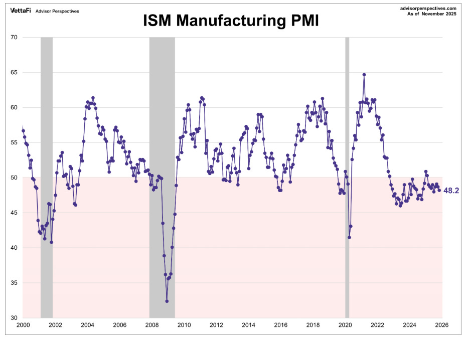 The Institute for Supply Management’s Manufacturing PMI slipped to 48.2 in November from 48.7 in October, marking a ninth consecutive month in contractionary territory. Readings below 50 indicate contraction, and this decline was driven by pullbacks in supplier deliveries, new orders, and employment. Input prices rose for the 14th consecutive month and at a faster rate than in October, reminding investors that goods inflation is not entirely dead even as headline readings improve.