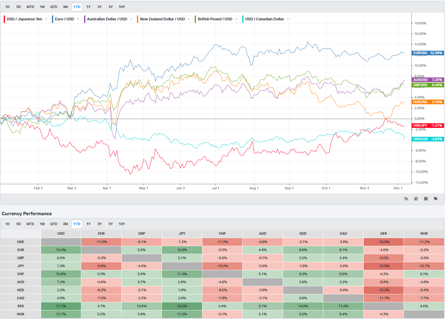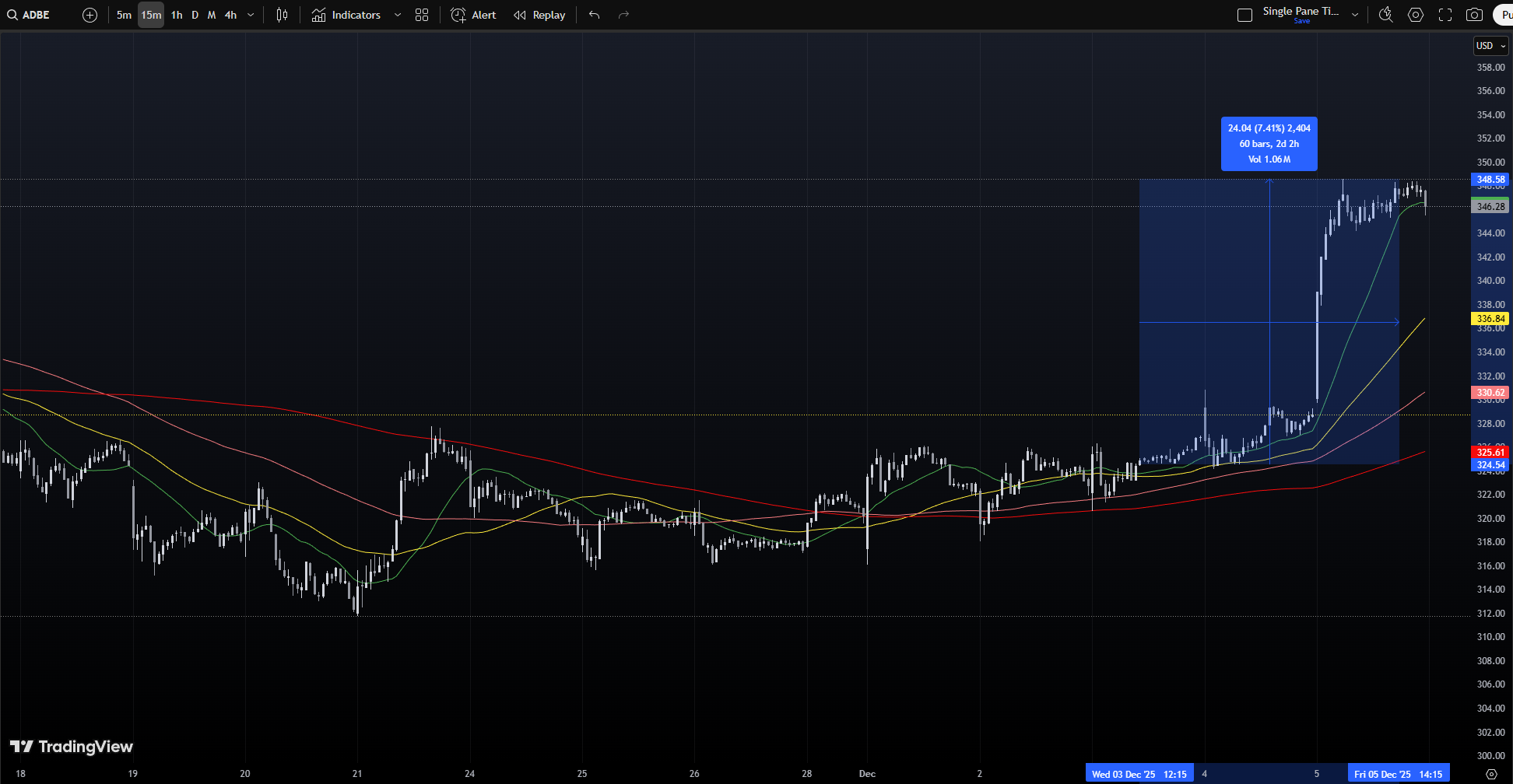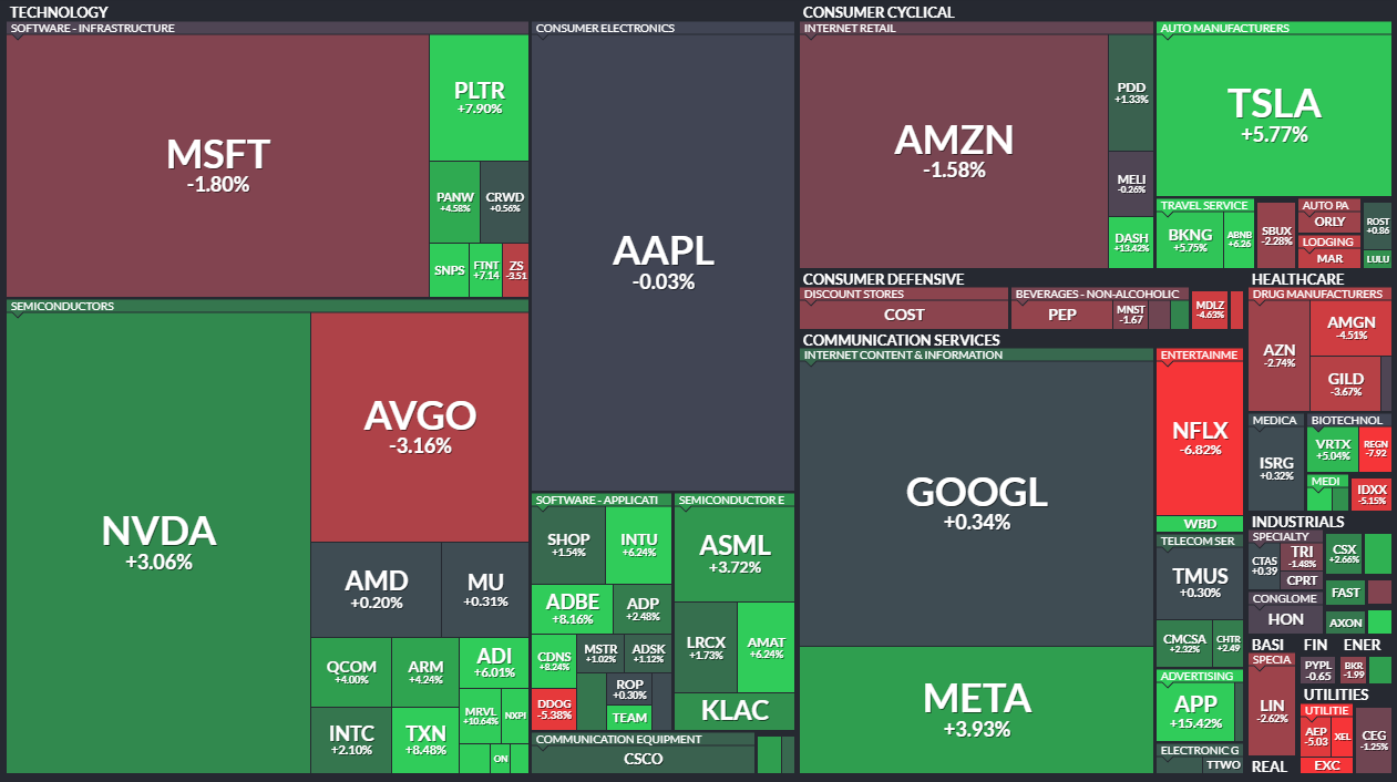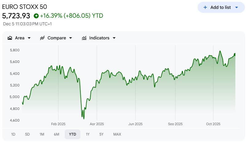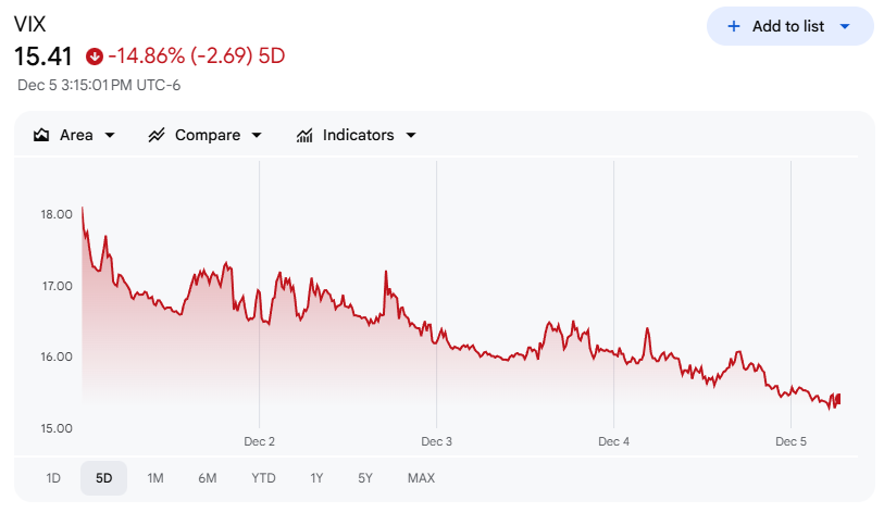 Volatility has compressed alongside the grind higher. The VIX has declined from around 26 on November 20 to below 16 now, which is a very mild level given the macro calendar ahead. That combination of steady price gains and falling volatility is exactly what you expect to see as markets price in a relatively benign path for rates and growth into year-end.