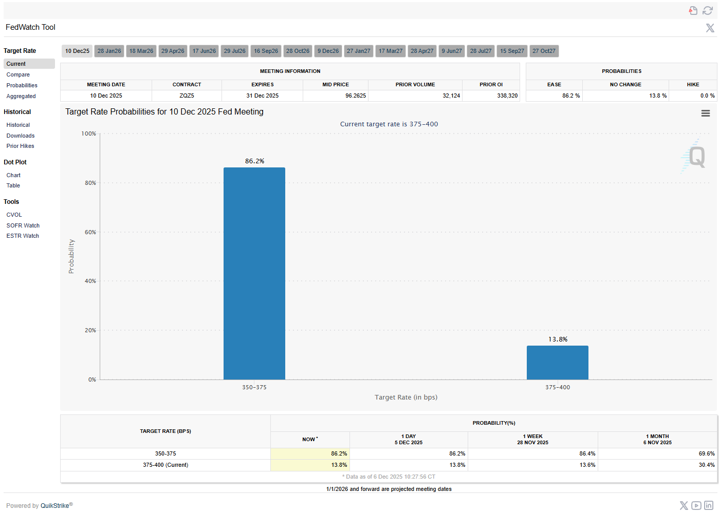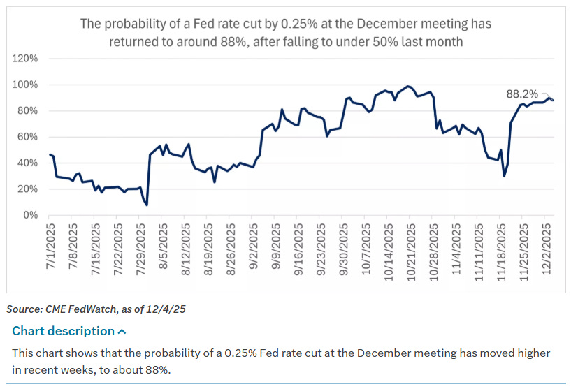 Market structure was influenced as much by the calendar as by fundamentals. Last week’s Thanksgiving holiday left trading volumes light and liquidity pockets shallow. Investors are now focused squarely on the Federal Reserve’s final meeting of the year on December 9–10, with markets discounting roughly a 95% probability of a 25 basis point rate cut and some probability gauges closer to the high-80s percent range.