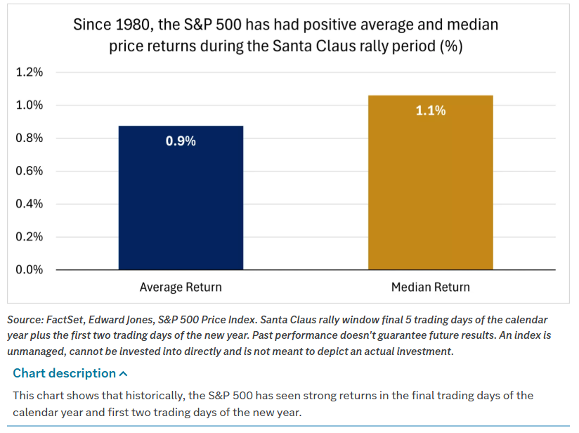 Under the surface, the story was about more than simple price appreciation. Optimism about the economic outlook, falling inflation expectations, and the prospect of another Federal Reserve rate cut next week underpinned the move. Market seasonals remain supportive as well. December is historically a favorable month, and investors are already debating whether we will get a Santa Claus rally during the final five trading days of the year and the first two of January, a period that has been positive roughly 73% of the time since 1980 with an average S&P 500 gain of about 1.1%.