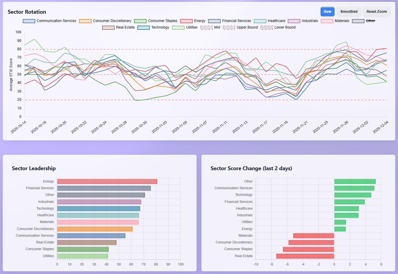 Energy and Materials show up quietly but persistently through LEU, WCPRF, VTOL, NB, TMQ, SGML, MTUS, and CMCL. This is not a headline oil trade; this is a supply-chain and resource-security trade, spanning uranium, industrial metals, and oilfield services. That fits neatly into the same structural narrative as Industrials: capital is maintaining exposure to hard-asset systems that underpin both energy transition and defense logistics.