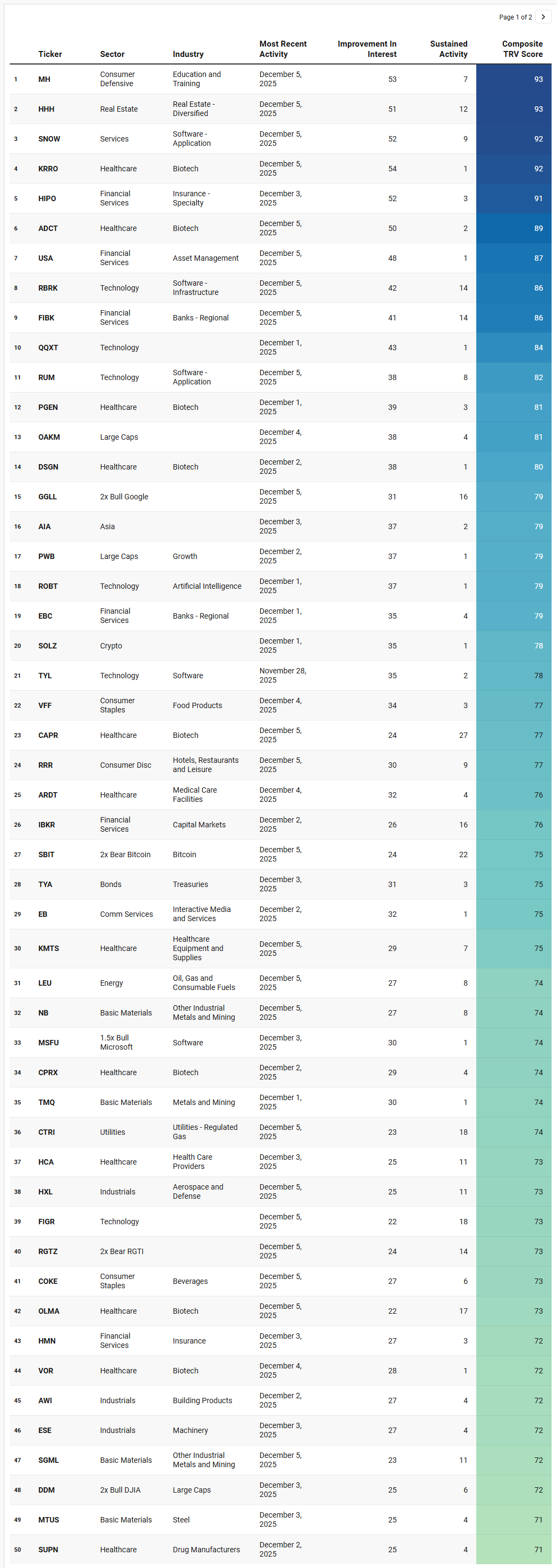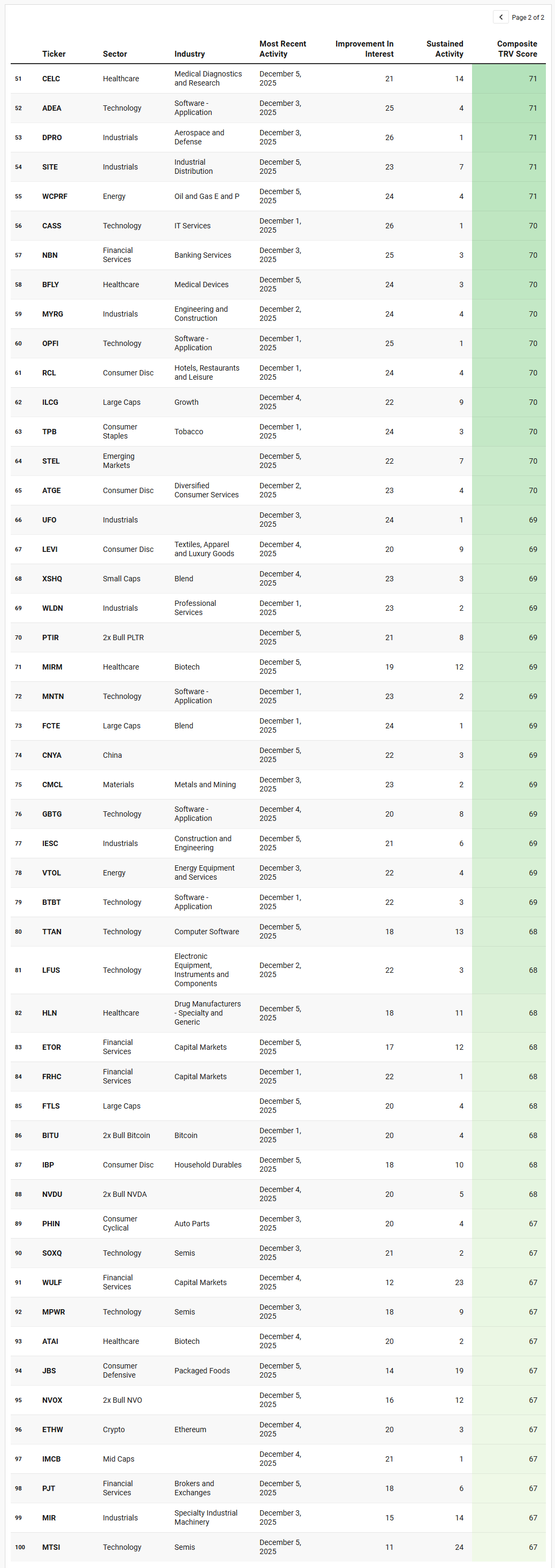 TRV is a proprietary metric that measures the recent acceleration or deceleration in institutional trading activity for a given stock by comparing its average trade rank over the past few days to its average in recent weeks. A sharp improvement in TRV typically reflects a notable shift in positioning, often accompanied by sustained trade activity, suggesting institutions are actively engaging with the name and that intensity of activity is rising. This often precludes meaningful price or narrative shifts. This isn’t a buy-list or sell-list; it’s meant to draw your eyes to names where institutions are putting money to work.