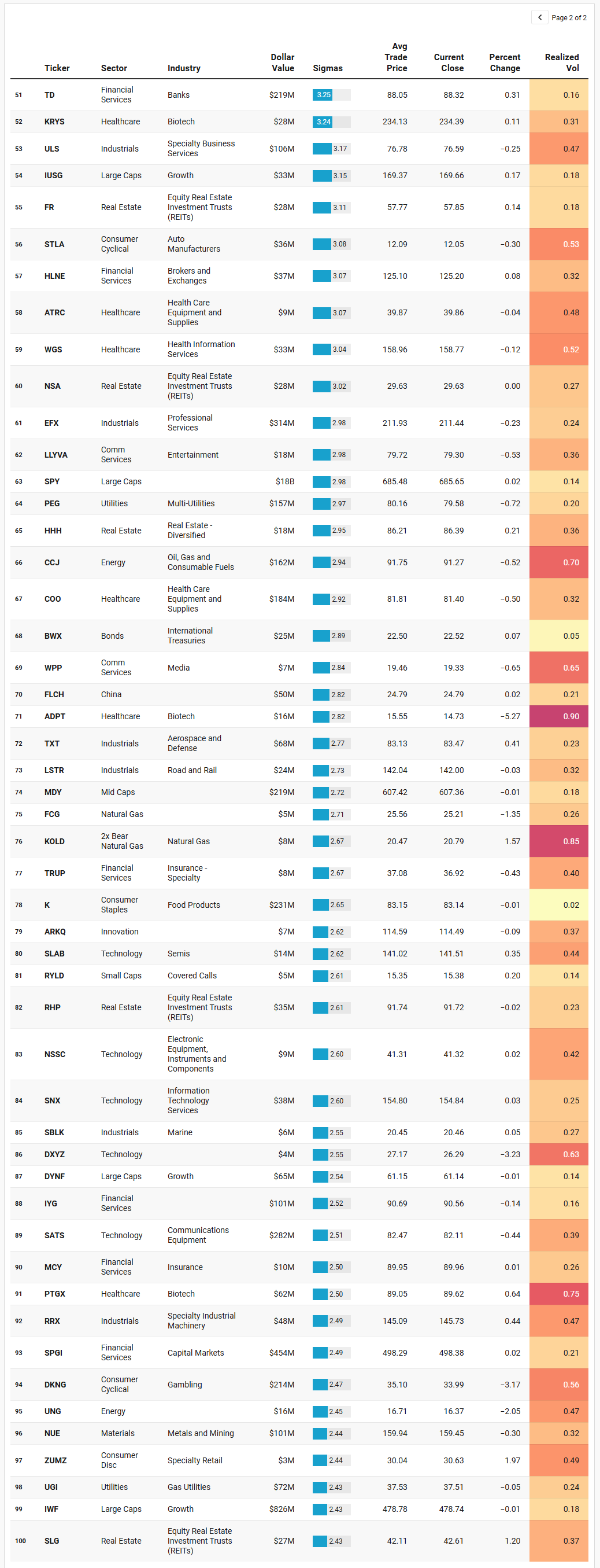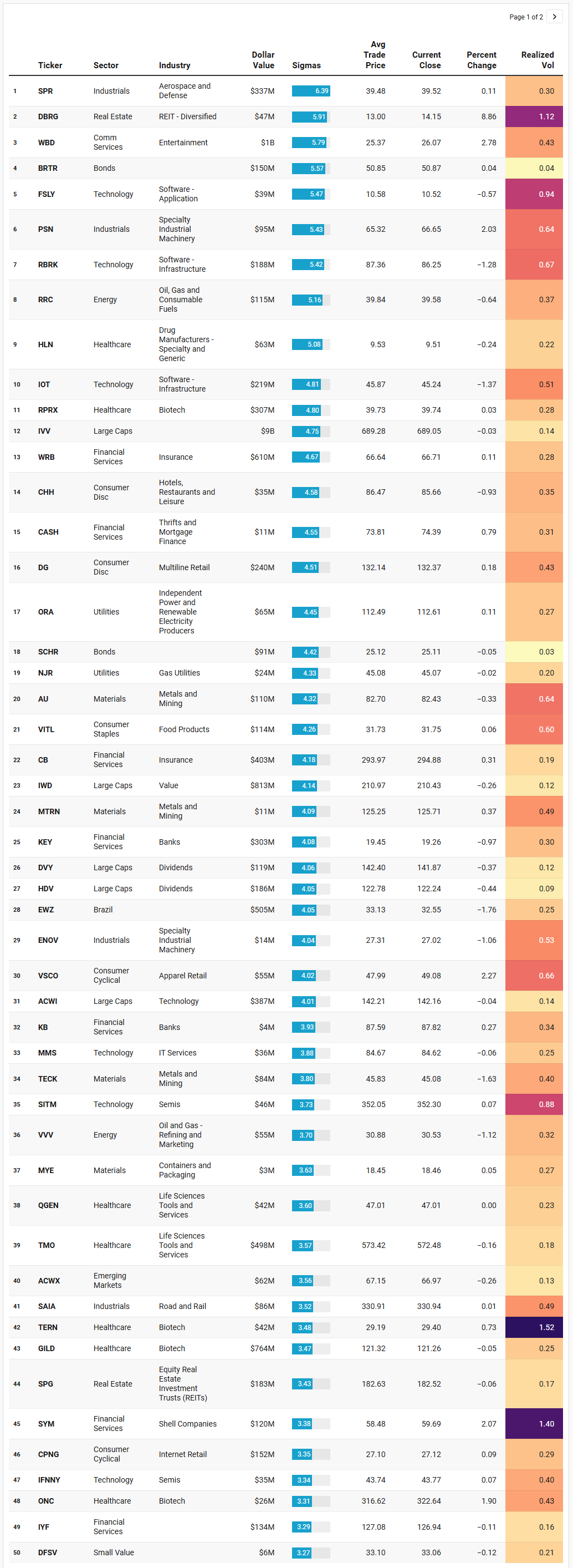Real estate and yield are also doing more work than a surface glance suggests. DBRG logs a nearly 9 percent gain on an almost six-sigma flow, which is the rarer case where outlier size does push price. SPG, FR, NSA, RHP, SLG, and HHH all print elevated activity as well, alongside dividend funds like DVY and HDV and staples names such as VITL and K. That ensemble tells you that investors are selectively re-risking into yield and real assets where balance sheets can withstand the current rate regime. The fact that most of these names move only a few tenths of a percent, despite multi-sigma flows, implies there is still plenty of two-sided interest; buyers are aggressive, but sellers are not being forced.