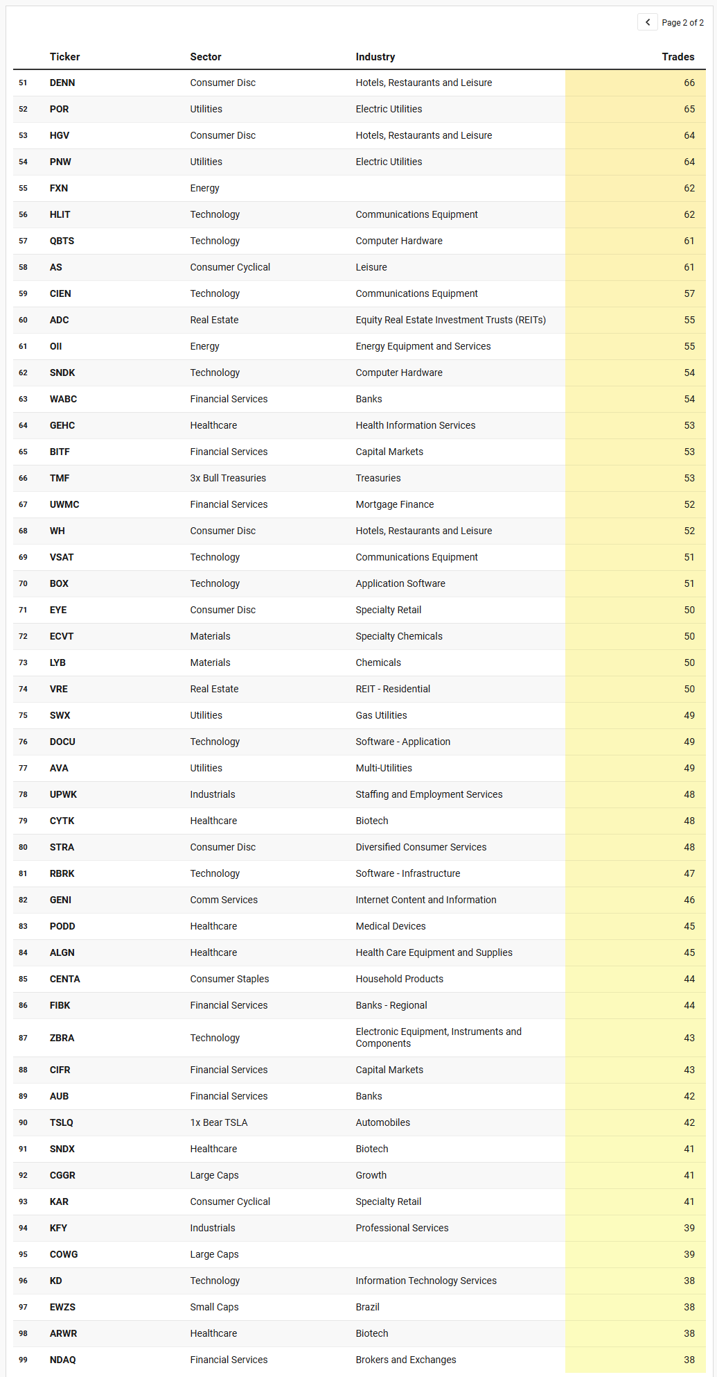 Financials show a bifurcated structure that mirrors what we observed in the broader flow data. Regional banks and insurance specialists such as FIBK, EBC, HMN, and HIPO are present alongside capital-markets names like IBKR, PJT, FRHC, ETOR, and WULF. This mix suggests that credit stress is not the defining driver right now; instead, transactional and advisory activity is being selectively accumulated, consistent with an equity tape that remains functional rather than fragile. The leveraged Dow proxy DDM appearing further reinforces that institutional risk is being expressed through index-adjacent vehicles rather than pure stock picking at the margin.