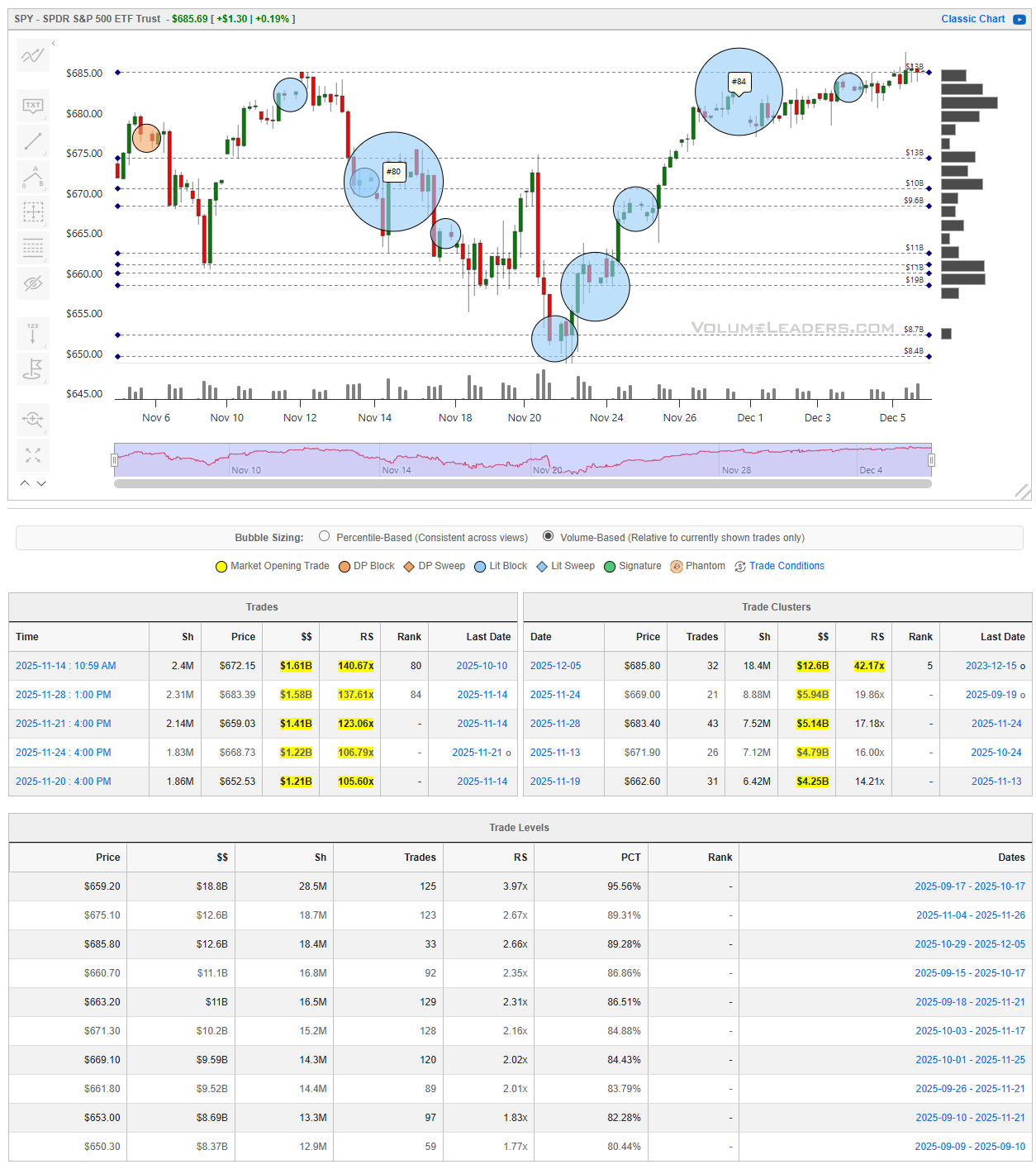 SPY printed one of the cleaner sequences of absorption and lift. Midweek weakness pressed into the low 660s, where repeated large prints appeared just ahead of the rally phase. The most prominent cluster sits at 685.80, carrying roughly $12.6B in notional and a relative size north of 42x, placing it in the extreme upper tail of recent participation. That zone now represents the dominant upside magnet and near-term battleground. Beneath it, the 669.00 and 671.90 areas stand out as secondary shelves, both built on multi-billion dollar turnover with double-digit RS readings. Earlier in the decline phase, heavy activity also accumulated near 662.60, which continues to frame the lower boundary of the current structure. Of note, a marked top-100 print tagged near the upper highs just below 685 underscores that large participants were active into strength, but price has not rejected that effort. The line of scrimmage is now clearly defined just below the 675 to 669 composite shelf. Acceptance above 685 opens the door to further price discovery. Failure back below 662 would flip the profile from continuation to failed breakout.