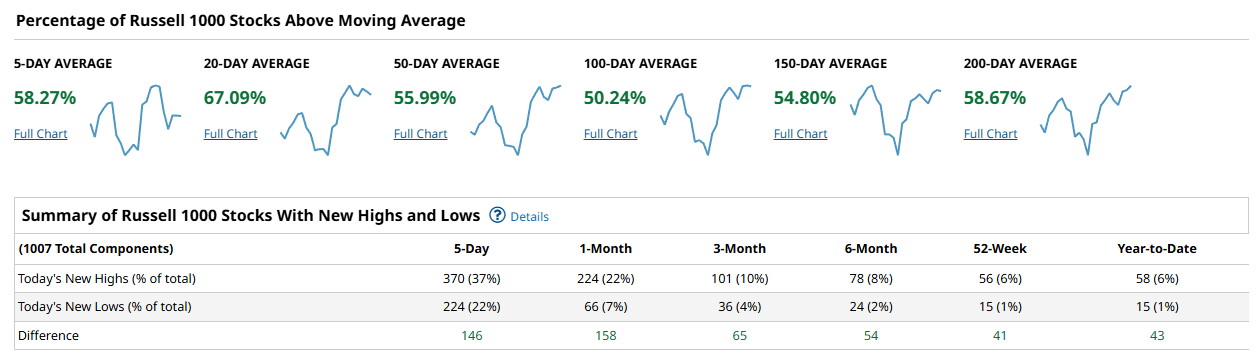 The Russell 1000 offers one of the clearer signs of broad participation returning underneath the surface. Short-term participation measures 58.27 percent above the 5-day and 67.09 percent above the 20-day. The 50-day sits at 55.99 percent, while only 50.24 percent remain above the 100-day. Longer-term participation improves again, with 54.80 percent above the 150-day and 58.67 percent above the 200-day. The most striking element here is the new highs minus new lows profile. Over 5 days the spread is +146, at 1 month it climbs to +158, with +65 over 3 months, +54 over 6 months, and still +41 at 52 weeks and +43 year-to-date. This is clear evidence that leadership and participation are materially broader here than in the cap-weighted benchmarks.