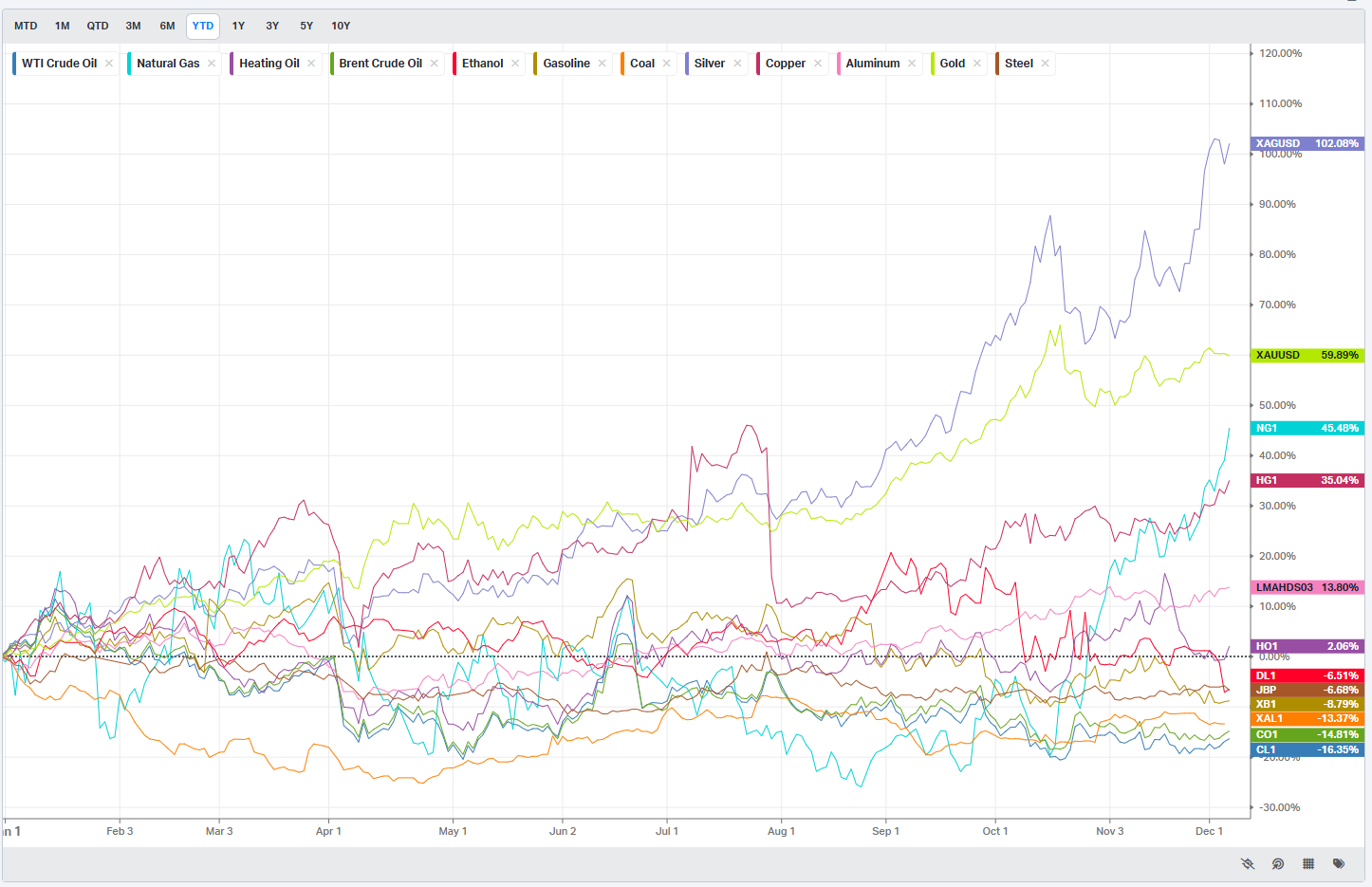 In agriculture, performance was mixed, with wheat among the standouts, up about 3% on the week. For some of us, any mention of wheat immediately calls to mind the book “The Day the Crayons Quit,” where the beige crayon laments being used only to draw wheat fields and turkey dinners. That feels about right for a market that has seen far more excitement in metals and crypto than in grains.