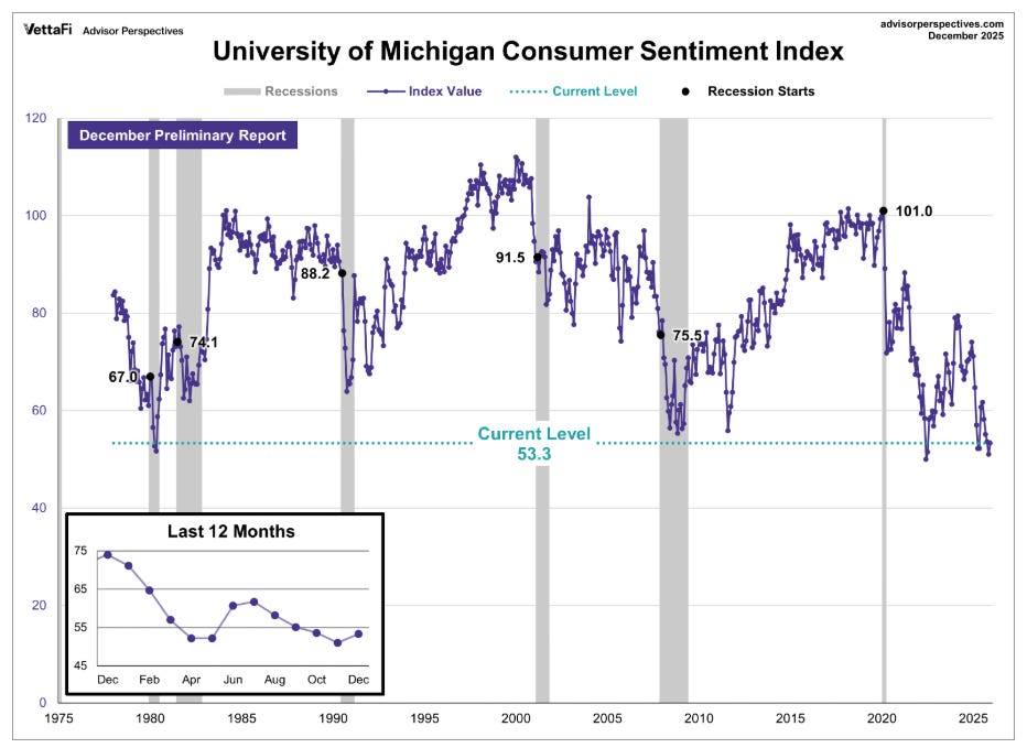 Survey-based measures tell a similar story. The University of Michigan’s preliminary December Index of Consumer Sentiment improved by 2.3 points from November to 53.3, beating expectations of 52.0. The gain was driven mostly by better expectations for personal finances, even though respondents continued to describe their overall views as broadly somber due to the ongoing burden of high prices.