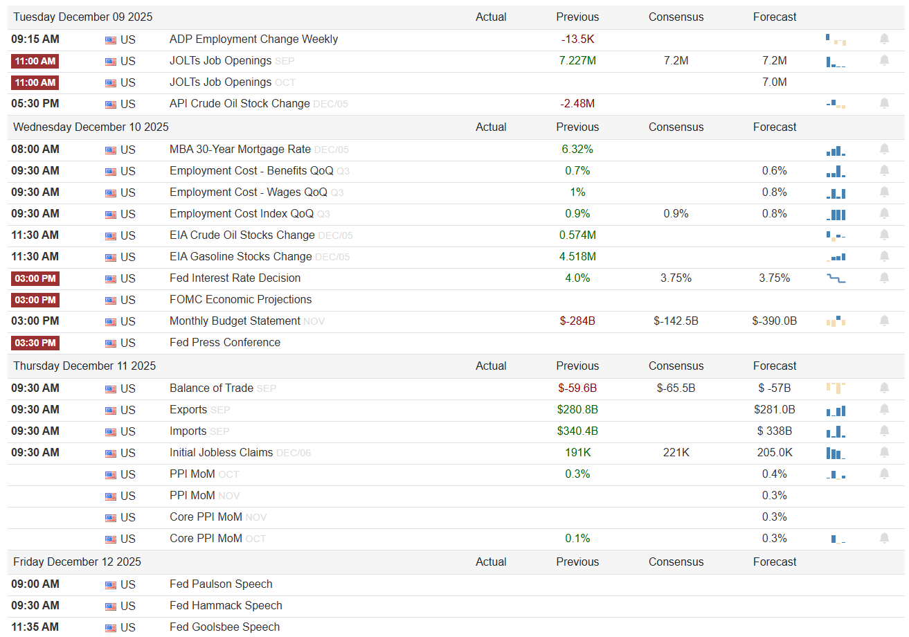 Second, the November nonfarm payrolls report on December 16 will provide a clean read on labor conditions after the data disruptions from the October government shutdown. Expectations call for 38,000 jobs added, an unemployment rate ticking up to 4.5%, and wage growth easing to 3.6% year over year. Combined with ADP’s negative private payrolls print for November, the fourth decline in six months, and the ongoing divergence between small and large employers, this report will be critical in shaping expectations for how far and how fast the Fed can ease without re-igniting inflation. At the same time, continued sub-200,000 weekly jobless claims around 191,000 would be a powerful counterweight to any narrative of imminent labor market collapse.