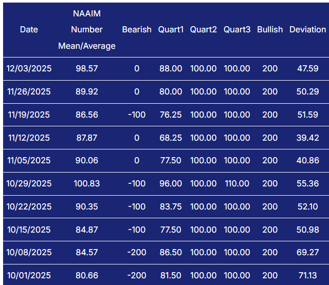 The NAAIM Exposure Index (National Association of Active Investment Managers Exposure Index) measures the average exposure to U.S. equity markets as reported by its member firms. These are typically active money managers who provide their equity exposure levels weekly. The index offers insight into how much these managers are investing in equities at any given time, ranging from being fully short (-100%) to leveraged long (up to +200%).