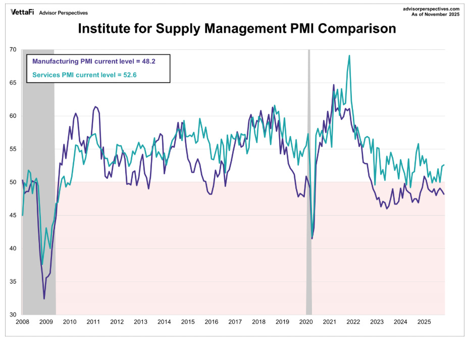 On the macro front, data painted a familiar picture of a two-speed economy. Manufacturing remains in contraction while services continue to expand, and the resilience of the consumer looks increasingly K-shaped across income and firm size.