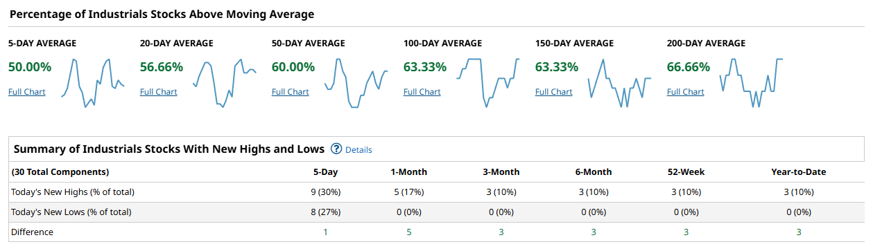 The Dow Industrials present a more balanced but less forceful picture. Exactly 50.00 percent of components are above the 5-day average, and 56.66 percent remain above the 20-day. Participation strengthens meaningfully at the 50-day with 60.00 percent above trend, and improves further at both the 100-day and 150-day with 63.33 percent at each. The 200-day reading stands at 66.66 percent, the strongest long-term figure among the large-cap benchmarks. However, the new high minus new low spreads are modest. The 5-day spread is only +1, with +5 at 1 month and +3 across 3-month, 6-month, 52-week, and year-to-date horizons. This tells the story of a market that is trend-stable but not accelerating in terms of leadership expansion.
