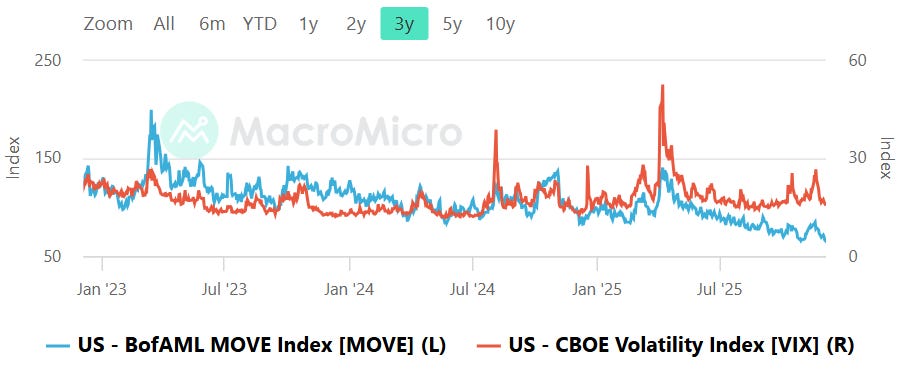 Both equity and bond volatility continue to compress, with the VIX holding at subdued levels and the MOVE index trending lower as well after the violent spikes seen earlier in the year. The most recent portion of the chart shows no active stress signal from rates markets and no meaningful repricing of equity risk. This alignment is important: the most destabilizing environments tend to emerge when bond volatility surges ahead of equity volatility, effectively warning that liquidity or policy transmission is becoming disorderly. That is not the case at present. Instead, both markets are telegraphing relative calm. The primary tripwires remain structural. A renewed MOVE surge back toward the 120 zone while the VIX remains suppressed would be an early warning of trouble under the surface. Conversely, a VIX push into the high teens would mark the first meaningful repricing of equity risk since this latest sentiment recovery. As long as both series remain jointly restrained, the backdrop favors trend persistence rather than shock.