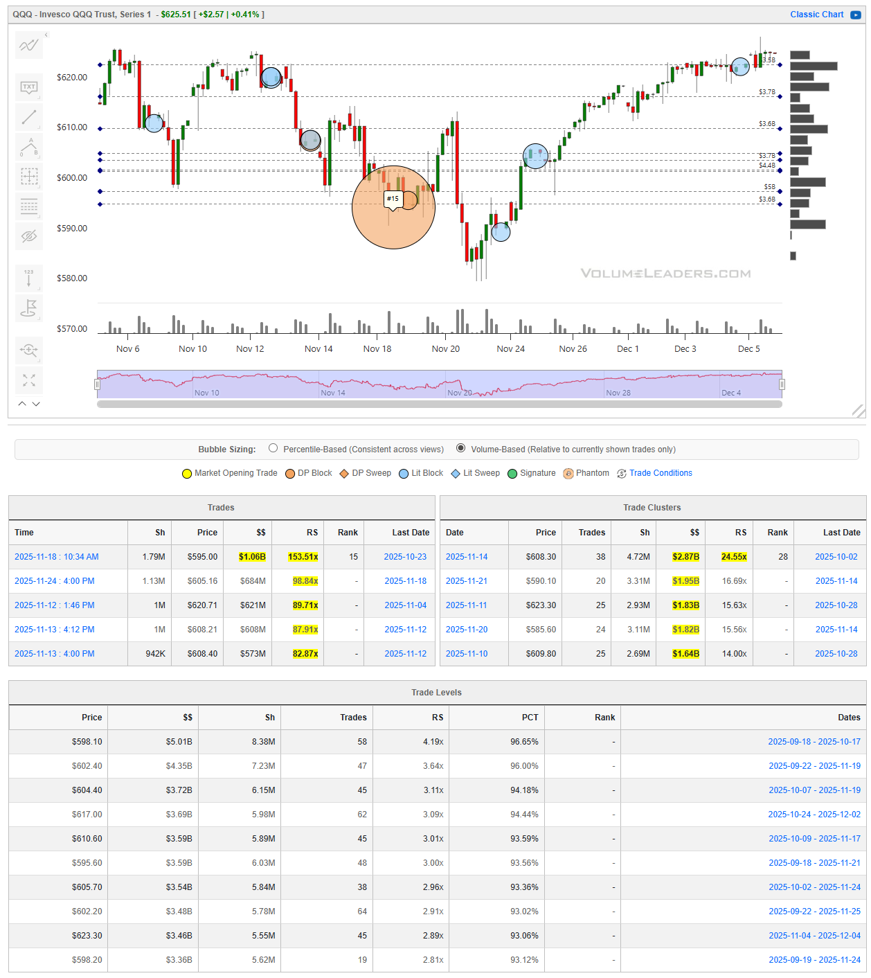 QQQ followed a nearly identical playbook but with a deeper midweek flush and more dramatic single-session absorption. The most dominant print in this window is the large tagged transaction near 595, labeled among the top historical trades, which coincided with the intraday low of the downswing. That event marked a textbook capitulation-into-acceptance sequence, as price immediately stabilized and transitioned into a steady ascent. The most active upside cluster since then sits near 608.30 with nearly $2.9B and a relative size in the mid-20s, while additional dense turnover developed at 609.80 and 623.30. On the volume profile, the richest long-term shelves reside between roughly 598 and 605, where multiple levels show $3B to $5B in cumulative notional with RS readings above 3x and percentile ranks in the mid- to upper-90s. This defines the core demand zone that underwrote the entire rebound. As long as QQQ continues to hold above the 604 to 598 band, the path of least resistance remains upward. A sustained rotation back into that pocket would be a normal retest. Clean failure through it would materially alter the trend structure.