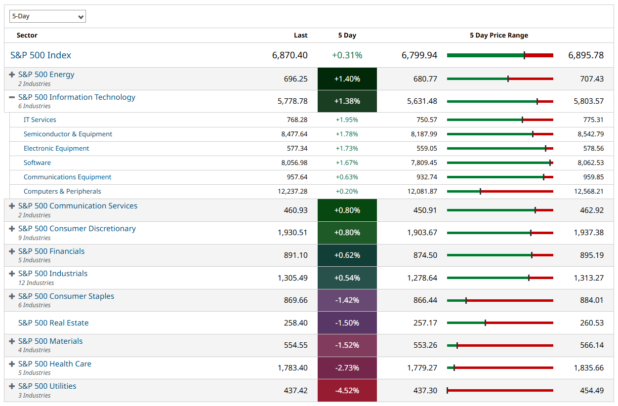 Sector performance was mixed, with 6 of 11 sectors finishing higher on the week. Energy led, aided by higher crude and gas prices. Tech was also near the top of the leaderboard, driven primarily by semiconductors rather than the usual mega-cap suspects.