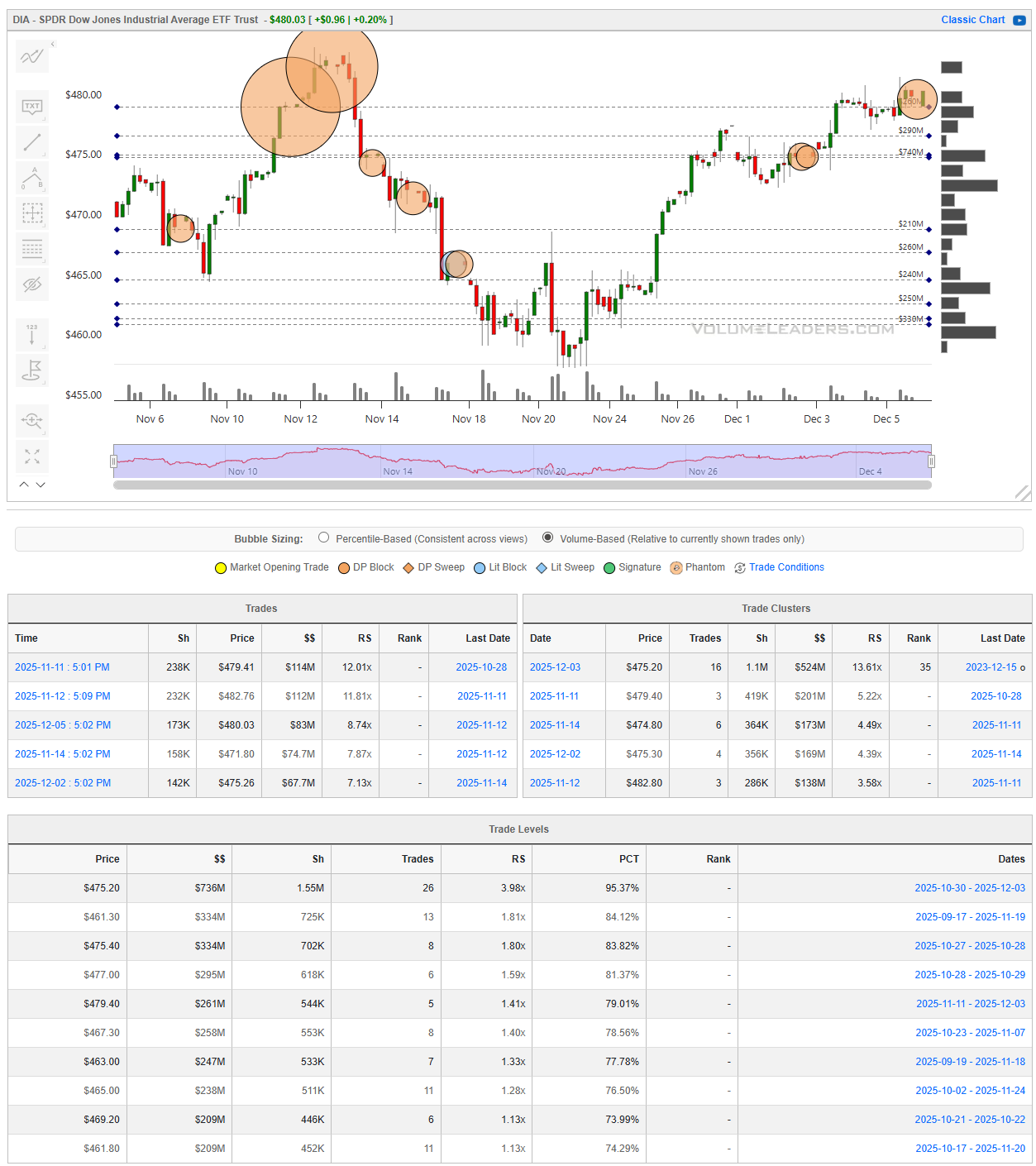 DIA has traced the cleanest mean-reversion arc of the four. Heavy supply was registered near the 479 to 482 zone early in the window, with multiple orange-type prints clustered in that area. The ensuing selloff found responsive demand just above 460, where price stabilized before beginning a measured recovery. The most important recent cluster sits at 475.20 with just over $500M in notional and a relative size around 13x, now functioning as the primary pivot. Adjacent shelves at 474.80 and 475.30 reinforce this mid-470s magnet. Long-term volume levels also emphasize the importance of this region, with the 475 and 461 bands showing the highest cumulative turnover in the profile. As long as DIA holds above 475 on a closing basis, the tape remains in balance-to-uptrend mode with scope to re-engage the upper 480s. A loss of 475 would expose the lower 460s shelf and shift posture back to defensive.