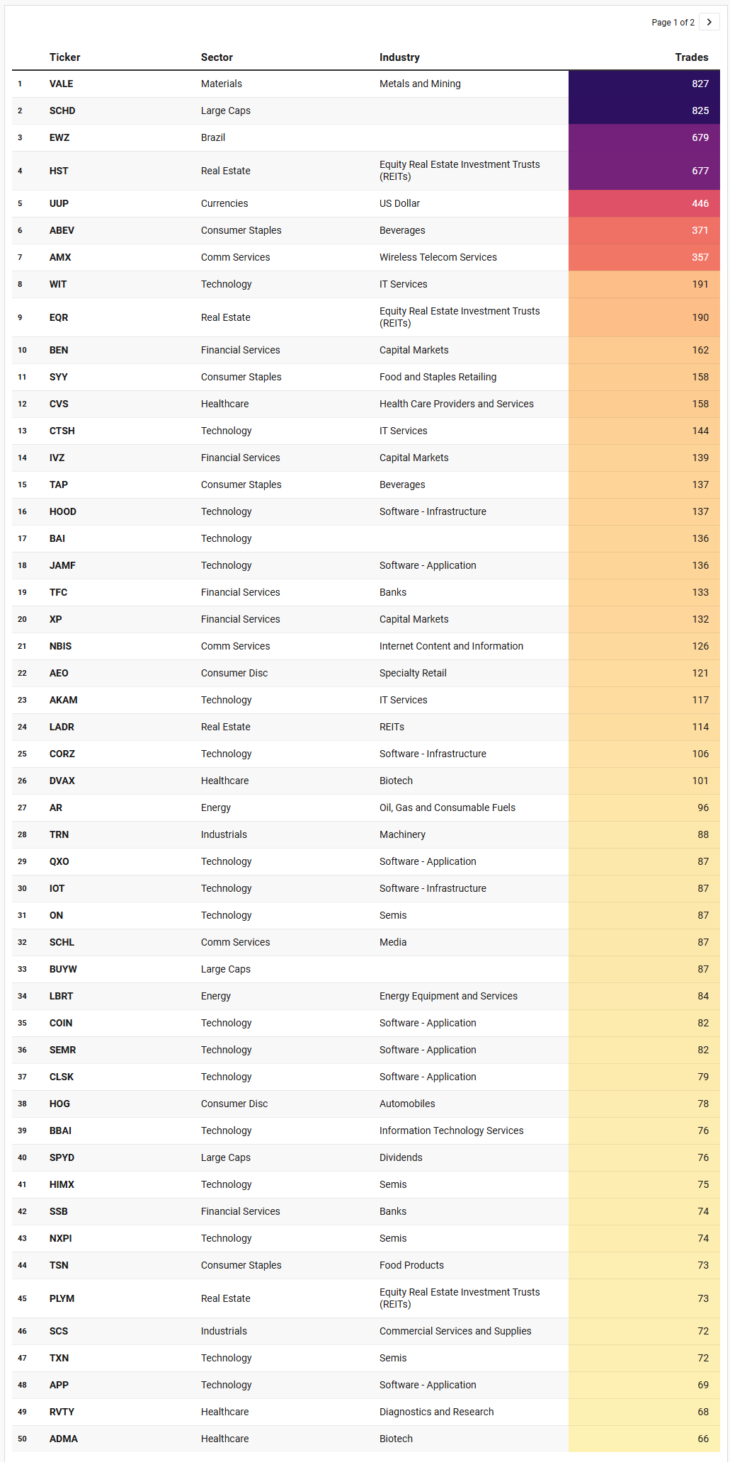 Real assets and defensives are the next obvious cluster. VALE sits at the top of the list with the most trades, joined by EWZ, EWZS, HST, EQR, PLYM, ADC, VRE, and materials names like ECVT and LYB. That is Brazil, metals, and U.S. REITs all punching out consensus levels together. ABEV and TSN give you beverages and food products, SYY and CENTA add food distribution and household goods. Put together, it looks like a market that is very actively re-basing its view on hard assets and cashflow-heavy defensives: where do we want to own Brazilian beta and commodity-exposed balance sheets, and at what cap rates and yields are REITs “good enough” in the current rate environment. The fact that several of these – VALE, EWZ, HST, EQR, VRE – also appear elsewhere in our flow work tells you this is not random noise; institutions are repeatedly engaging these tickers at the same zones until a new equilibrium prints.