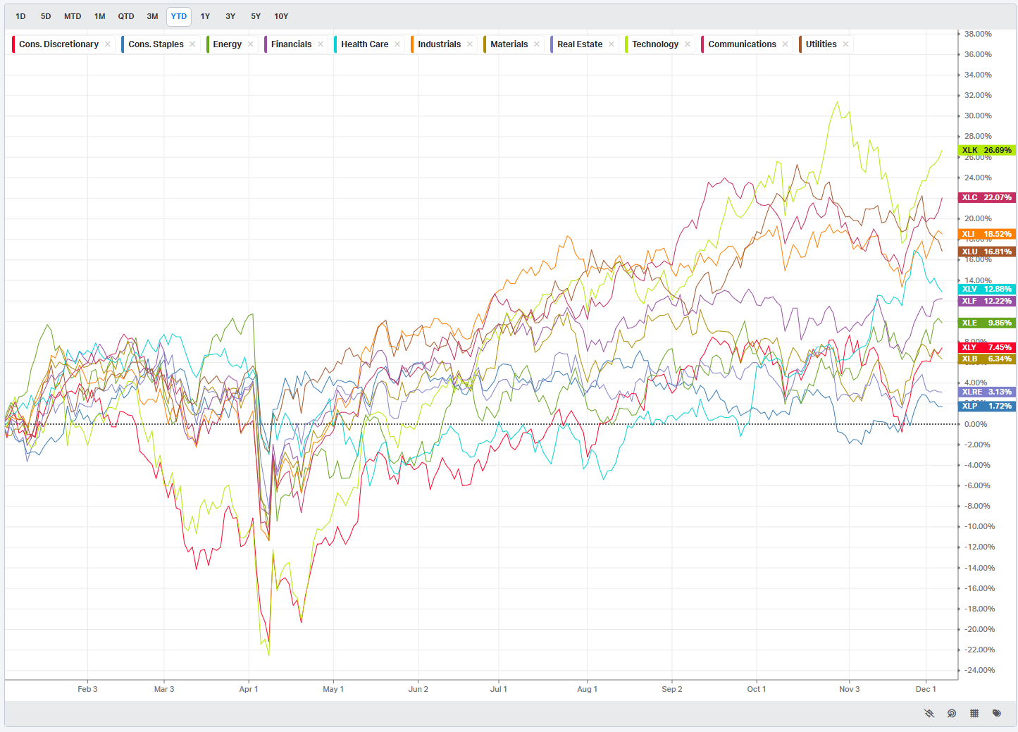 Financials also gained as yield spreads widened and labor data came in generally supportive of credit quality. Value-oriented and discount retailers climbed on the back of solid Black Friday and Cyber Monday data and constructive earnings commentary, even as the underlying message from those value-focused chains may be that the consumer is still hunting for bargains.